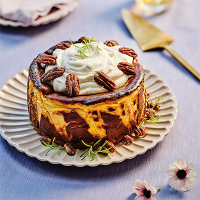- Top cheesecake with whisky whipped cream and garnish with toasted pecans before slicing and serving.