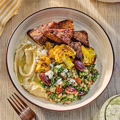 - Build bowls by smearing hummus on bottom of 2 or 3 bowls or plates and topping with roasted cauliflower, tabbouleh, tempeh, feta and black olives.