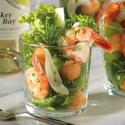 - To serve, stir gazpacho before serving. Ladle into chilled serving bowls and garnish with grilled shrimp.