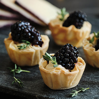 - Transfer spreadable brie into a piping bag. Cut a small hole at tip and pipe about 1 tsp (5 ml) brie, or more as desired, over blackberry jam. Top with a blackberry. Melt reserved 1 tbsp (15 ml) blackberry jam, then brush onto tartlets. Garnish as desired with thyme leaves, and serve.