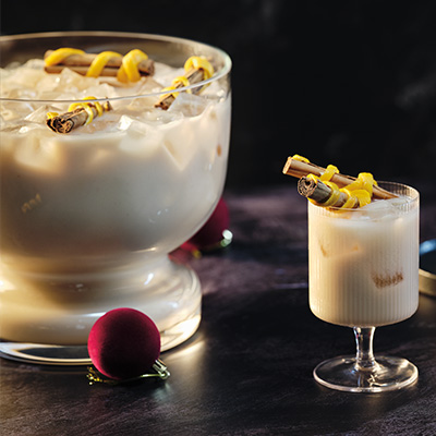 - In a punch bowl, combine whisky, sherry and Oat So Festive Nog Base. Whisk, then ladle into stemmed wine goblets and garnish each with an orange twist and cinnamon stick.