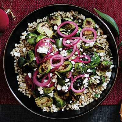- To plate, transfer sorghum to a platter. Top with Brussels sprouts, cooked olives and remaining uncooked olives, then sprinkle with feta and pickled onions.