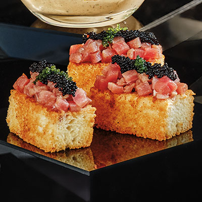 A fresh twist on a classic, these bite-sized appetizers are perfect for your next martini hour. The garnish of caviar adds a salty pop that mirrors the briny notes in a classic martini, making this pairing feel both timeless and modern. Whether you’re hosting a cocktail party or just want something special to go with your favourite libation, these bites are elegant, easy to prepare and undeniably indulgent. Enjoy this appetizer alongside Suntory Roku Gin.Ingredients